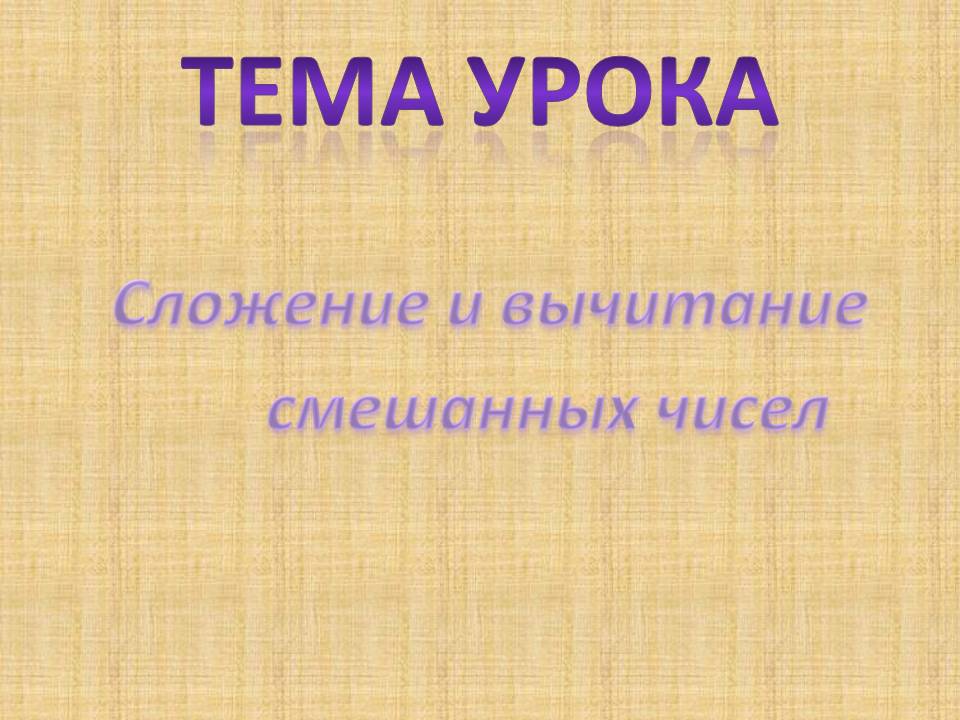 Слайд 3. Тема урока. Сложение и вычитание смешанных чисел.